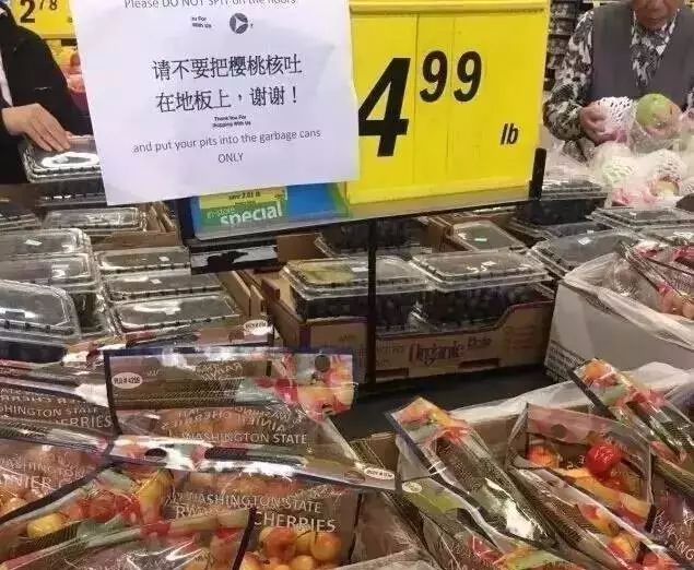 更让人羞愧的是,超市竟然用中文标牌写出:只求大家吃完后,不要把樱桃核扔在地上就行了。