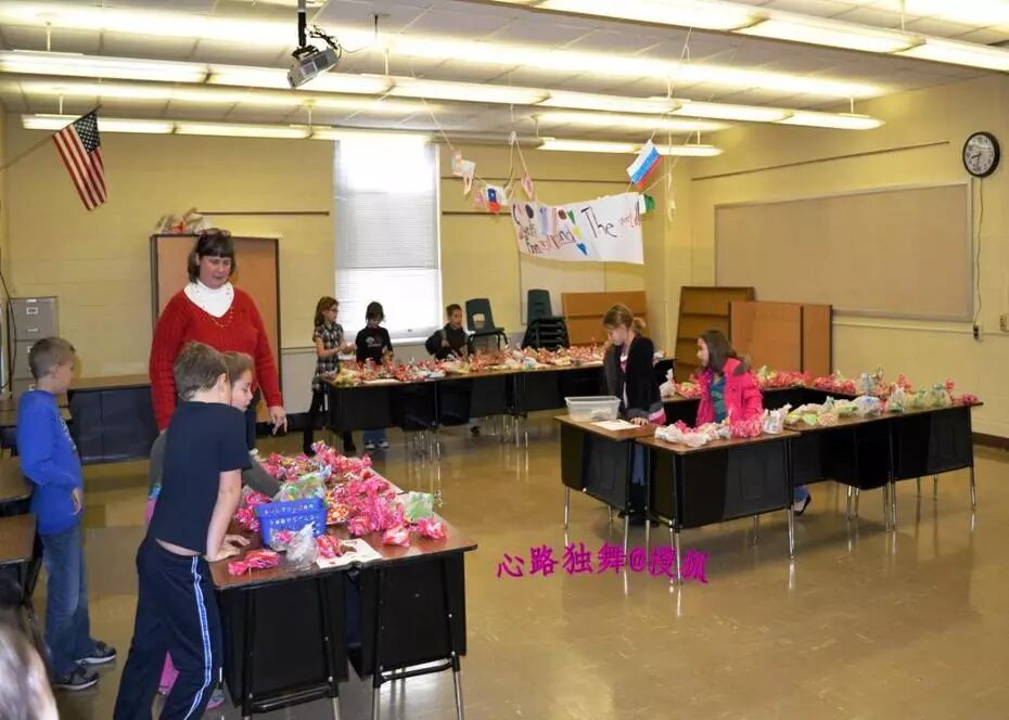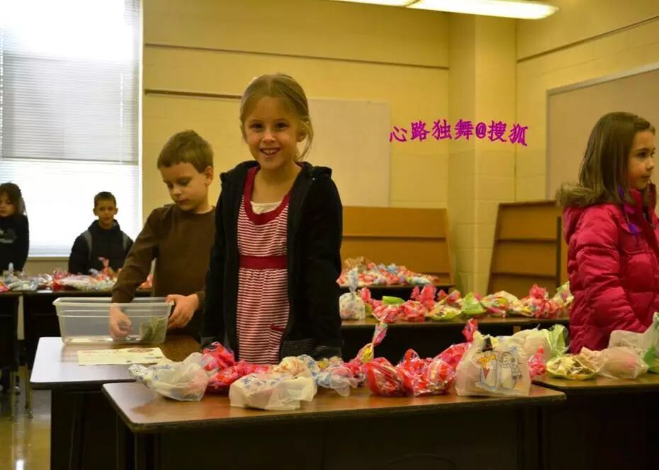 每一小包或者50美分,或者1美元。孩子们负责布置现场、介绍产品、计算售价、收钱、找钱、清理残局等,老师只是旁观,必要时给予指导,销售的收入作为填补外出活动的缺口。其它年级的孩子、老师、和家长积极配合购买,活动搞得有声有色。秀秀这是我买回来的。