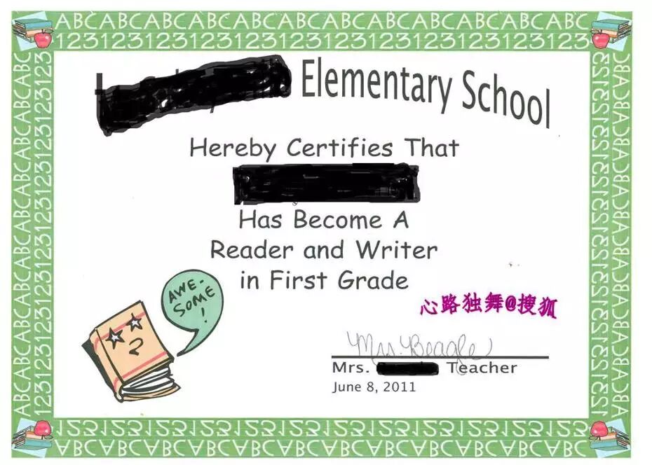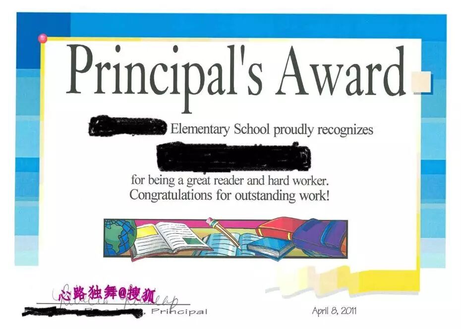 阅读能力的养成之重要,在学年底的授奖中便可见一斑。这是丫丫一年级毕业时获得的校长奖(一个班一到两个),其中专门提到阅读的突出、并强调了她非常“努力”这个优点,正应了美国教育中的这句话:不是在于你有多聪明,而是欣赏你有多努力。