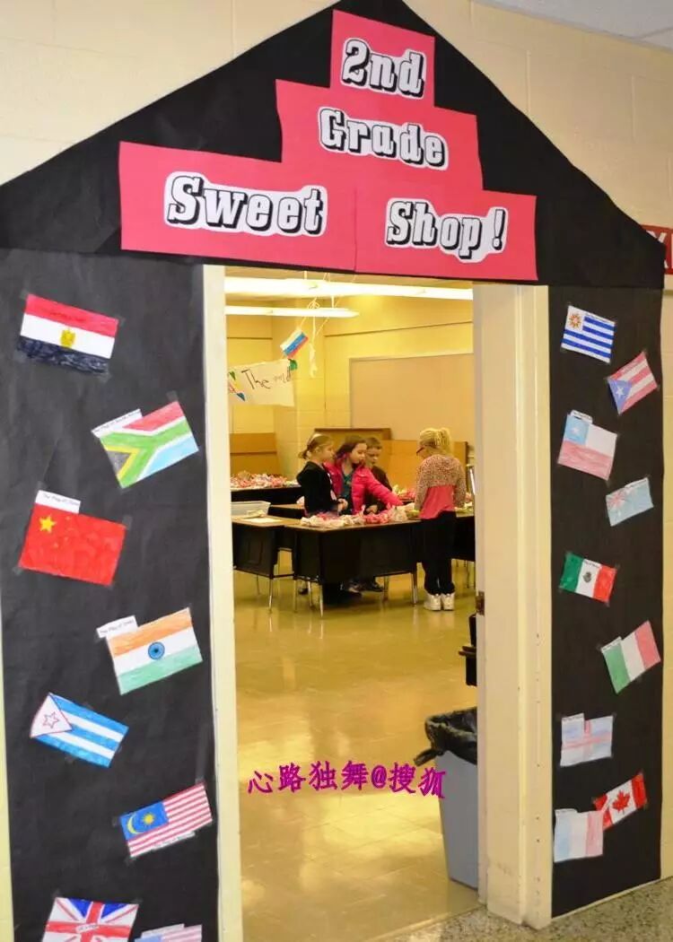 学校建议家长、尤其是来自不同国家的家长,贡献出不同国家的特色甜点的半成品,拿到学校,由老师和孩子们一起烘烤完成,在这个过程中同时介绍与其相关的文化,然后装饰打包,卖给家长、老师、和学校的其他学生。这是正在销售的场景,又看到中国国旗了吧!