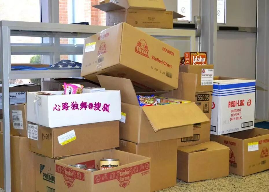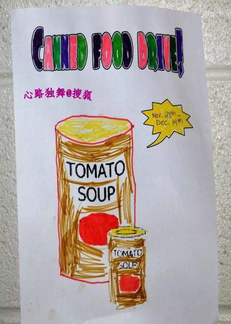 另一项活动是对弱势群体的关注,让孩子们意识到这个国家也有人很穷,有可能连吃饭都困难,只要我们有能力,就应该伸出援手,比如节省零用钱,积极参与各地食品“银行”节日期间发起的 “Food Drive"(捐献食品,作者译)活动,这是孩子们设计的罐头捐献活动的海报和募捐到的食品。