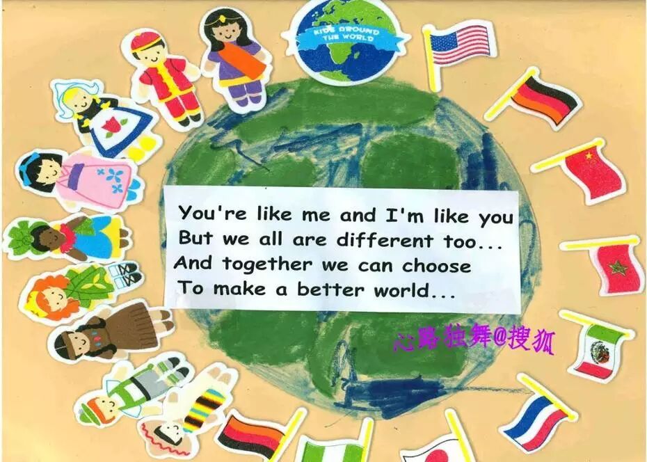 围绕这个教育宗旨,学校举办了一些活动,其中的一项活动是"国际日”,帮助孩子们认识到美国是一个多民族、多种族、多宗教、多文化的移民国家,应该学会容纳、接受、和尊重,这是孩子们为国际日设计的宣传品,中间的文字翻译过来的大意是:我们相同,我们也不同,携起手来,我们将会创造一个更好的世界。看到中国国旗了吗?