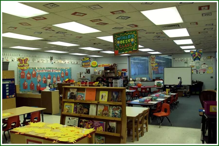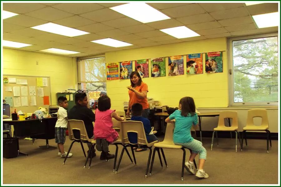 二年级的教室,上面悬挂着“世界最好的班级”的牌子,霸气和自信的培养是贯彻在美国学生的日常细微之处的。中间的桌子是写字、画画用的,但是不必用桌子的时候,他们也会围坐在地上等,一个班级有15个孩子的样子,就这样校长还很抱歉,说是她理想的二年级班级是不超过12个学生。