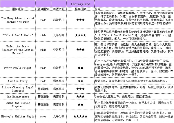 Fantasyland:The Many Adventures of Winnie the Pooh 小熊维尼,“It's A Small World”真善美的小世界,Under the Sea - Journey of the Little Mermaid 小美人鱼,Peter Pan's Flight彼得潘, Prince Charming Regal Carrousel旋转木马