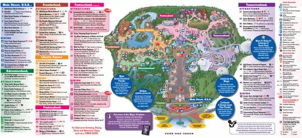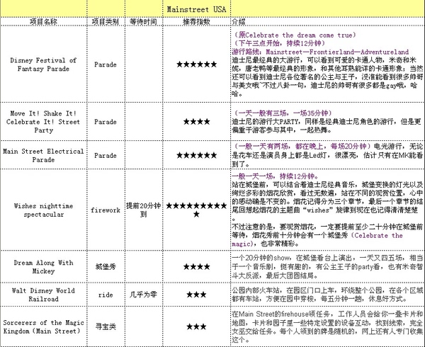 MK分为六大部分:Main Street U.S.A., Adventureland, Frontierland, Liberty Square, Fantasyland, Tomorrowland.