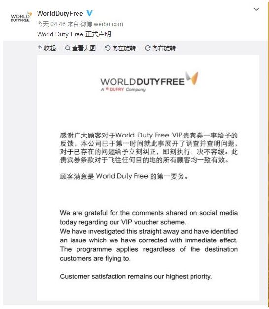 2月12日,伦敦希思罗机场和WDF分别发帖道歉,并表示“调查改正”。该公司在推特和脸书账号上发布中英文声明。