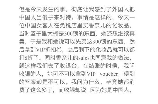 2月11日凌晨(北京时间),有自称在伦敦希斯罗机场第二航站楼免税店打零工的中国留学生爆料称该机场内World Duty Free SpA(简称WDF)免税连锁店搞价格歧视——中国消费者需消费1000英镑才能领取VIP券,而其他国家消费者只需消费79英镑即可领取,而深陷舆论漩涡。