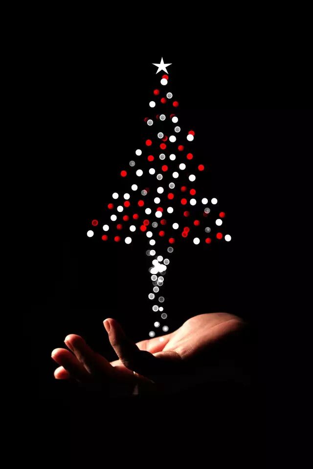 当然,如果具有更好的拍摄环境,我们可以借助错位拍摄,拍出更有意思的画面。以下面的图来说,拍摄时,我们需要保证手部有一定的补光,而圣诞树用彩灯和细铁丝捆成,或者直接将远处的圣诞树虚化成更小的光斑,只要保证光比够大,就能让其他部分隐藏在黑色中。