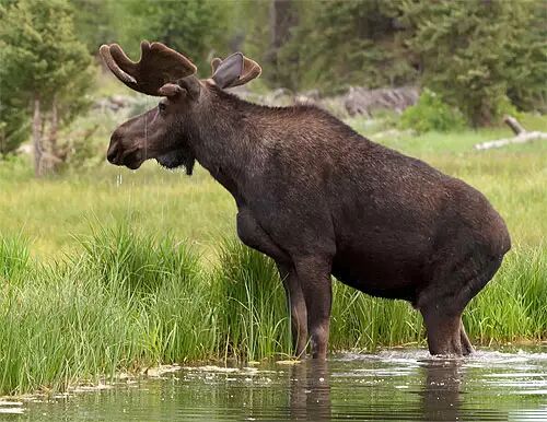 驼鹿( Alces alces ),这是世界上最大的鹿,肩高1米7到2米1,而且肩部明显隆起,再加上鼻子宽大,所以有点像骆驼。驼鹿和马鹿一样,生活在欧亚和北美大陆北部的森林,不过分布的纬度更高,它们自带雪地鞋——张开的蹄子。这庞然大物还是游泳好手,曾创造过游过1公里宽的湖面的记录。