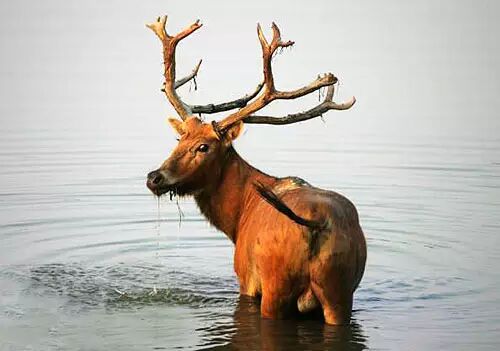 麋鹿( Elaphurus davidianus )是我国的一个特有物种,不过属于出口转内销的货。它曾经分布在从东北到华南的各种湿地,可是在20世纪初就在中国绝迹了。幸亏英国的11世贝福德公爵私人搜集了18头圈养在自家庄园,这个物种才免于灭绝。到了20世纪80年代,英国分两批向中国捐赠了38头麋鹿,麋鹿这才算是重返故土……