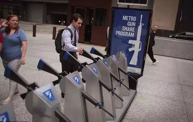 运用时下最火热的共享经济模式,设置10把仿真步枪在街头,意在讽刺美国的枪支泛滥、购买枪支太过随意。