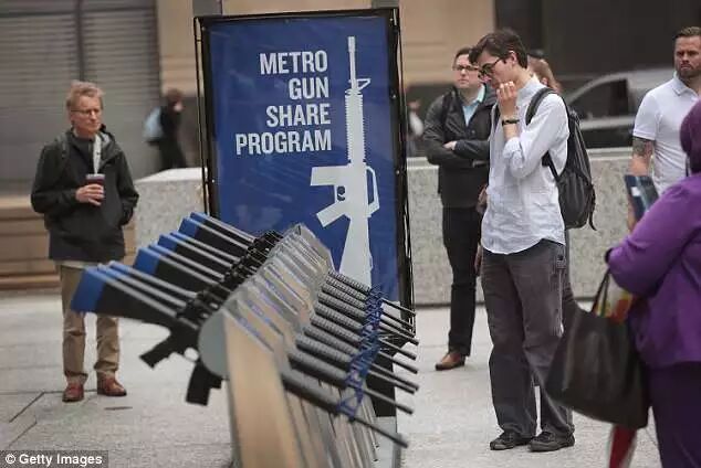 据中国日报报道,此次戴利广场上出现的一组AR-15突击步枪的共享站,是沿用共享单车的理念,这个枪支共享计划貌似是为人们提供共享武器的服务。