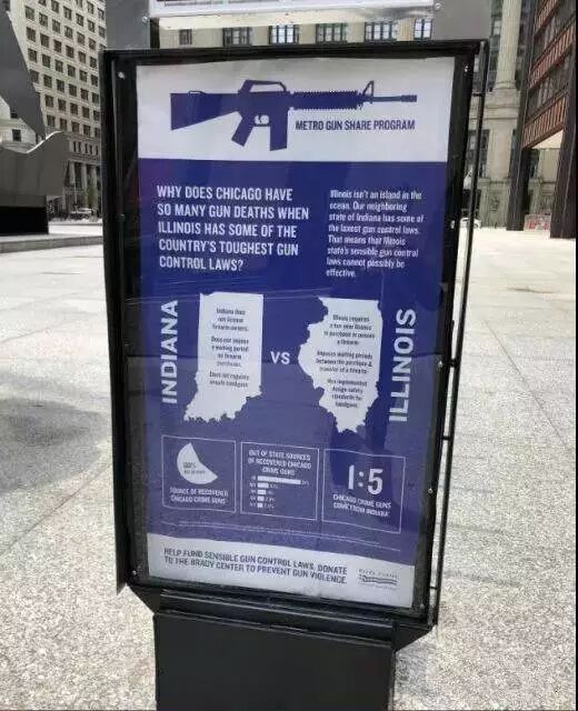 从指示牌中我们可以看到写着如下字样:为什么伊利诺伊州有着最严格的控枪法案,但芝加哥还是有那么多人死于枪击?