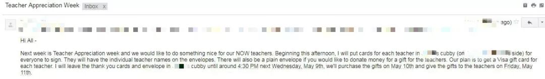 谢师周的前一周朋友收到Pre-school负责人发来的邮件: