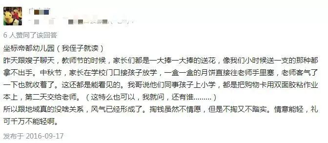 最后,也要承认无论是美国还是中国都会有个别师德败坏的老师存在,他们确实会“看礼下菜”(美国的老师为此付出的代价会惨重,所以比例远小于国内)。网上就有一位中国家长报出过班里的老师说“谁送礼我可能不记得,但没送的我一定记得。”听到这类话家长敢不送?也是无奈。