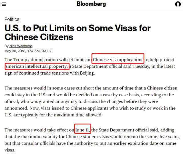 美国将收紧到美国大学研读机器人技术、航空和高科技制造等专业的中国留学生签证,他们的签证有效期将被限制在1年。