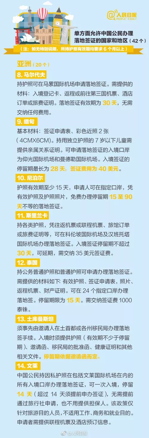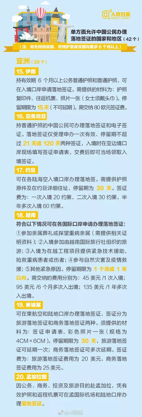 单方面允许中国公民办理落地签的国家和地区(42个)
