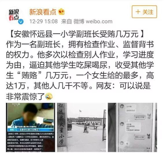 安徽怀远县一小学副班长兼语文科代表,拥有检查作业、监督背书的权力。他多次以检查别人作业,学习进度为由,逼迫学生吃屎喝尿,收受其他学生“贿赂”几万元。这个小朋友全班只有七个人,他上网上学,有专门的孩子骑车接送(自行车),他要来的钱,有专门的孩子替他保管……